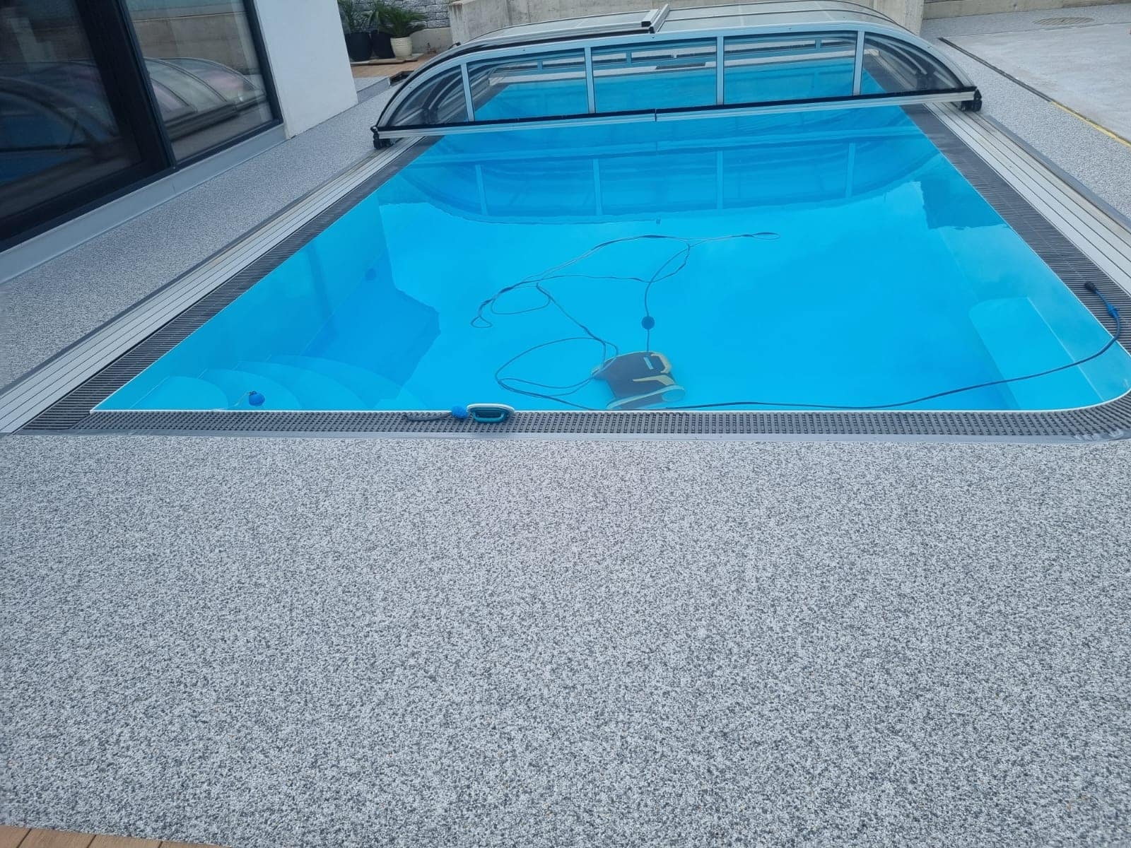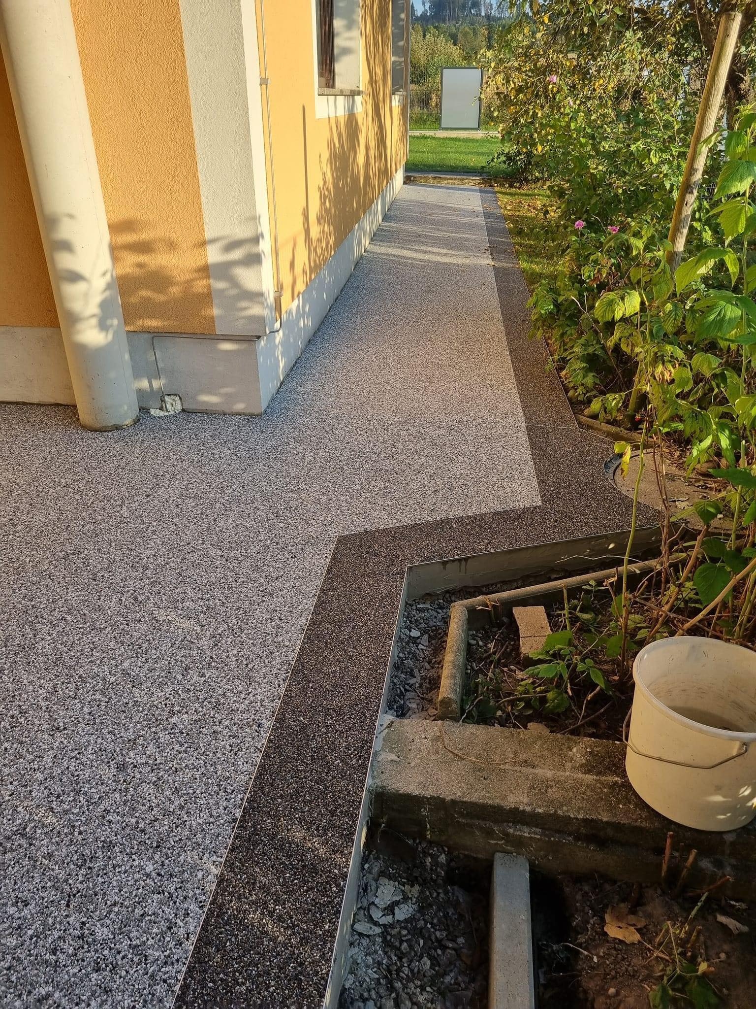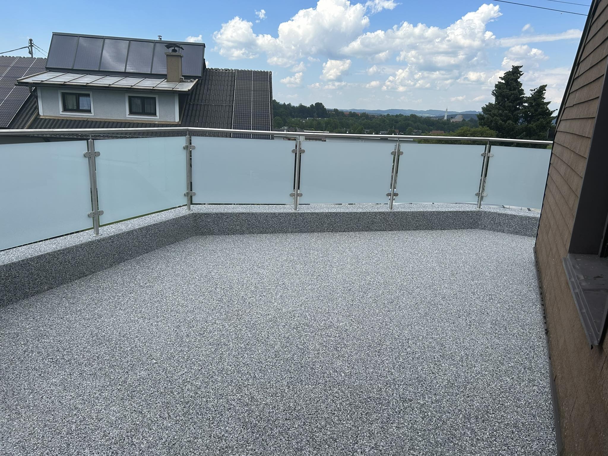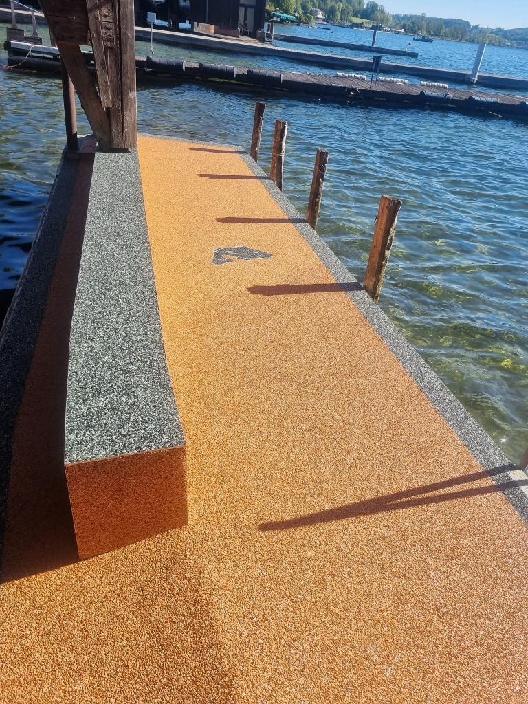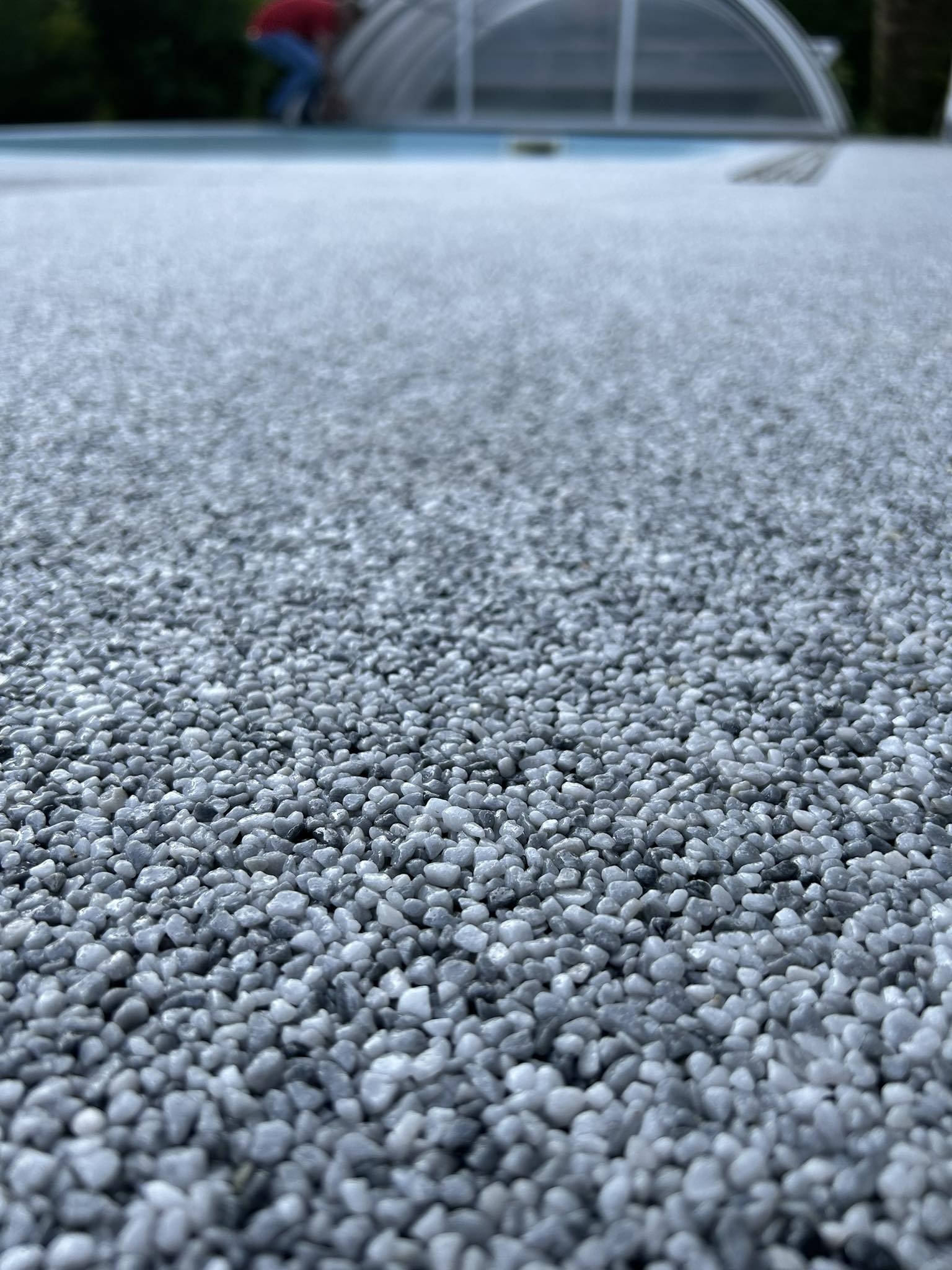 Ein Steinteppich ist die ideale Bodenlösung für Poolumrandungen, Terrassen und Gartenbereiche. Die Kombination aus natürlichen Marmorkieseln und hochwertigem Bindemittel sorgt für eine rutschfeste, langlebige und optisch hochwertige Oberfläche. Besonders rund um das Schwimmbad bietet ein Steinteppich viele Vorteile: Er ist wasserdrainierend, sodass Regen- und Spritzwasser schnell abfließen können, und bleibt dadurch angenehm trocken und sicher. Gleichzeitig ist die Oberfläche barfußfreundlich, pflegeleicht und UV-beständig.