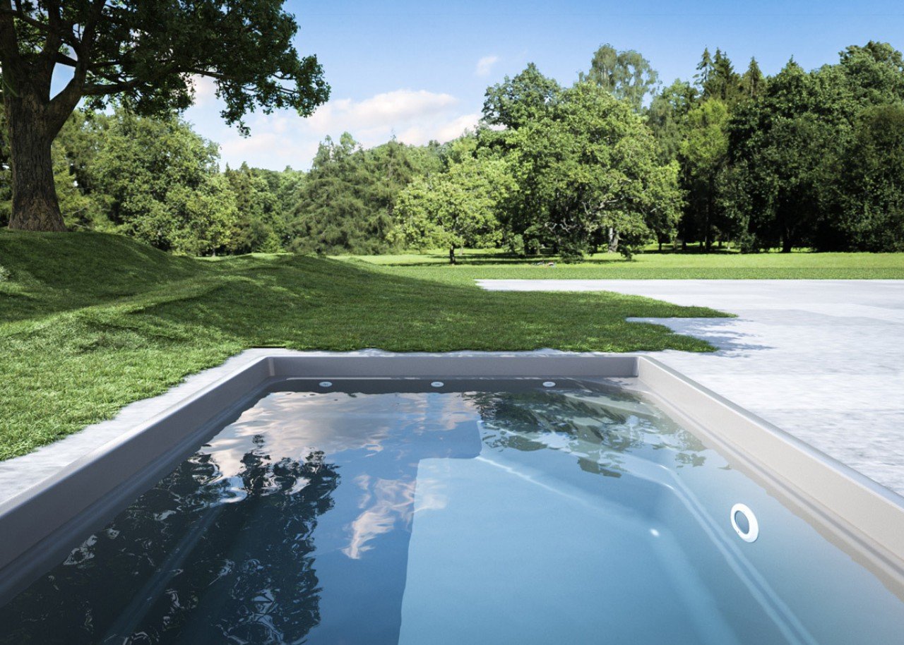 Das Keramikpool Aurora mit asymmetrischem Aufbau verfügt über eine bequeme Treppenreihe in der Ecke. Durch die in der gesamten Länge zur Verfügung stehenden Schwimmbahn ist dieses Modell eine gute Wahl für aktive Schwimmer.